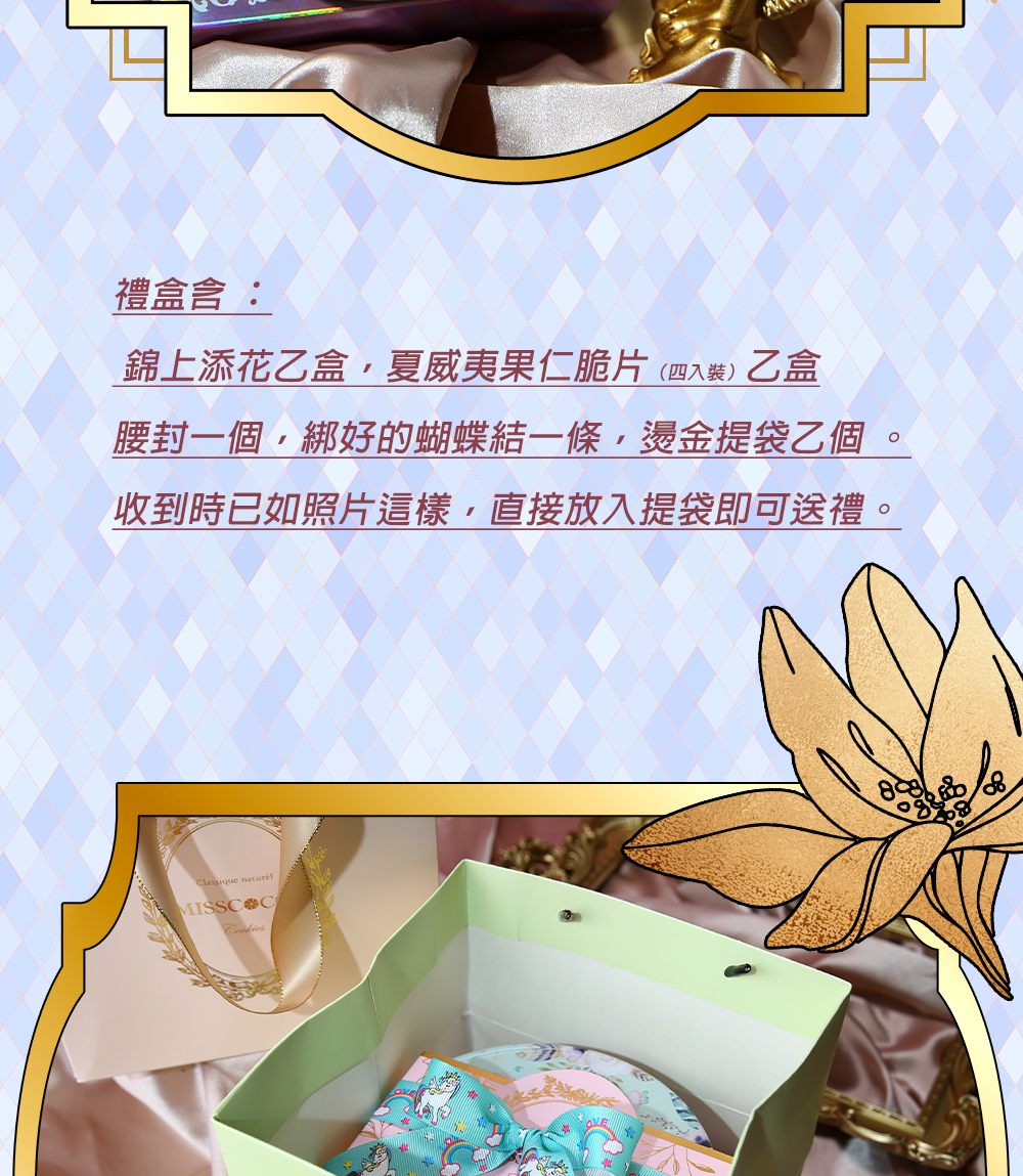 ※內含:「錦上添花」雙層綜合鐵罐裝×1盒+夏威夷果仁脆片四入裝×1盒