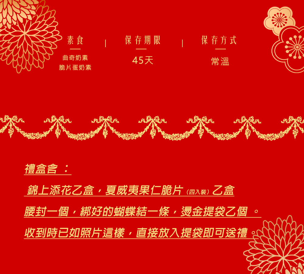 ※內含:「錦上添花」雙層綜合鐵罐裝×1盒+夏威夷果仁脆片四入裝×1盒