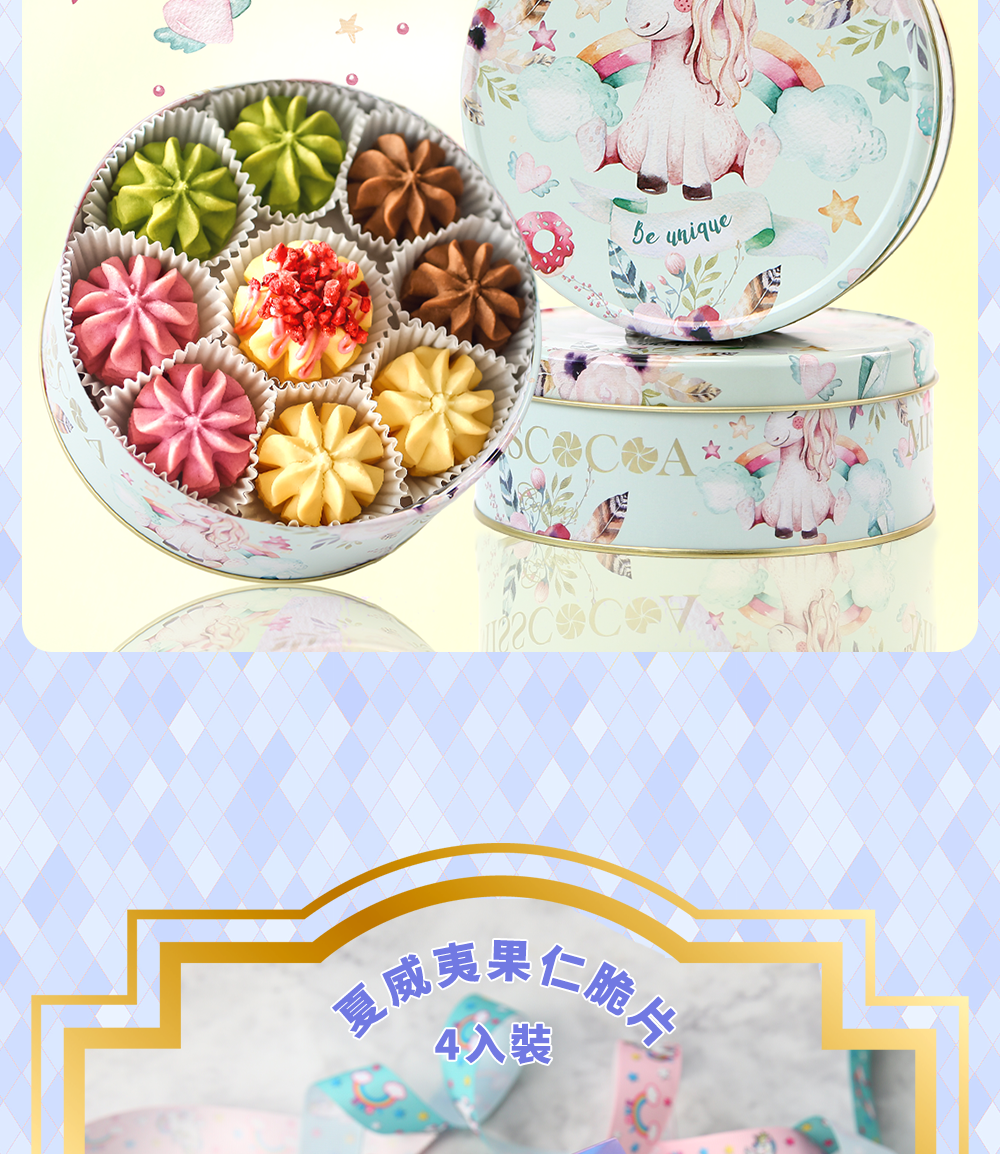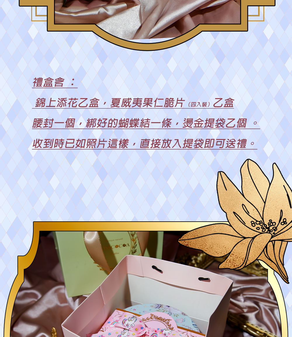 ※內含:「錦上添花」雙層綜合鐵罐裝×1盒+夏威夷果仁脆片四入裝×1盒